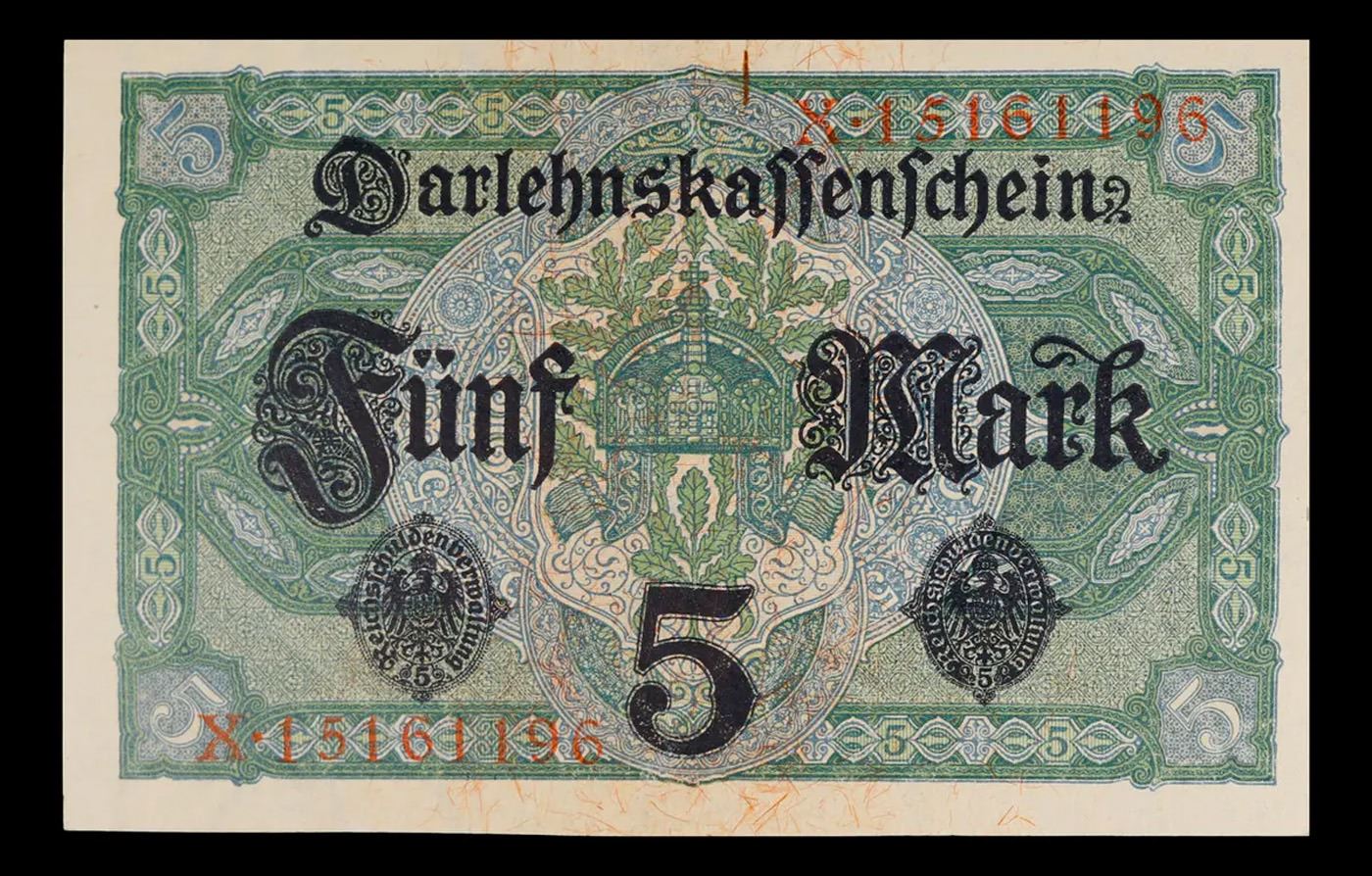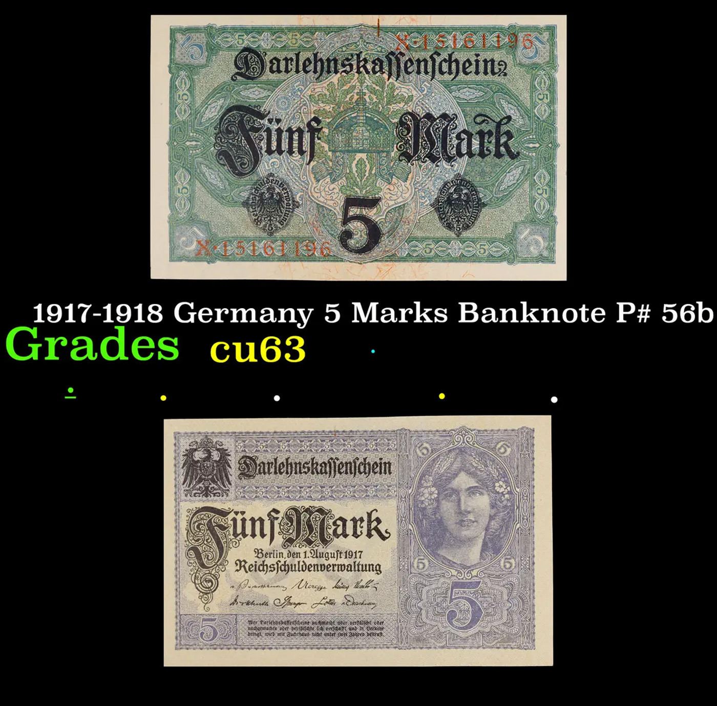 1917-1918 Germany 5 Marks Banknote P# 56b Grades Select CU. In August 1914, Directly after the onset of WW1, the German Empire removed the gold backing of the mark and issued new currency. After the fall of the German Empire in 1918, the newly formed German Weimar Republic issued another new currency, known derisively as the "Paper Mark", which faced massive hyperinflation.
