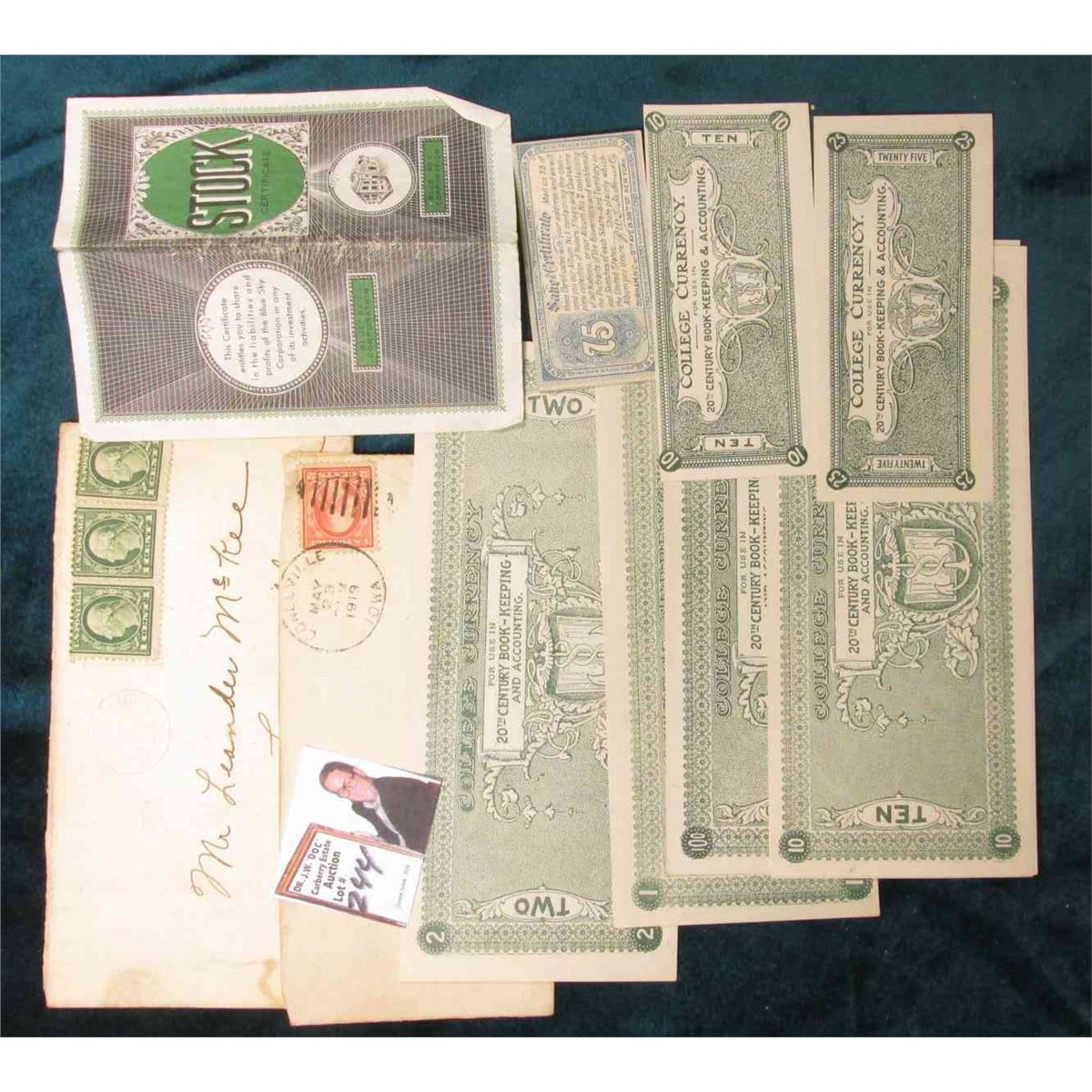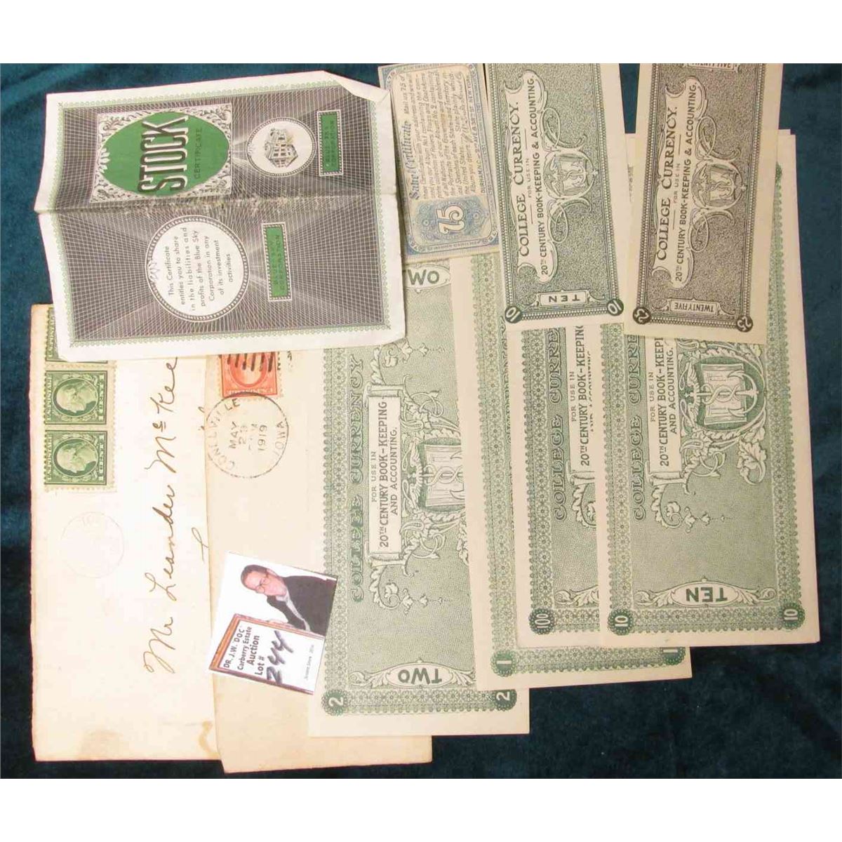 1917 & 1919 Postmarked envelopes with several One Cent George Washington Stamps addressed to Conesville, Ia.; "Blue Sky Corporation Stock Certificate"; "Muscatine, Iowa Merchant's Bridge Ticket for Illinois Residents Good For 5c"; Duke & Sons 75 Certificate; & a 7 Piece Group of College Currency, which 'Doc' had valued at $90.00.