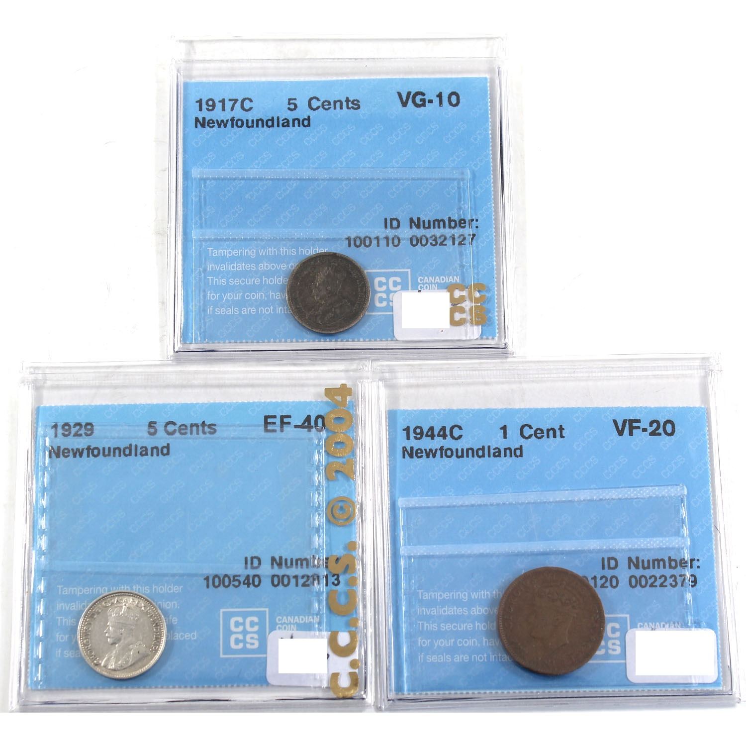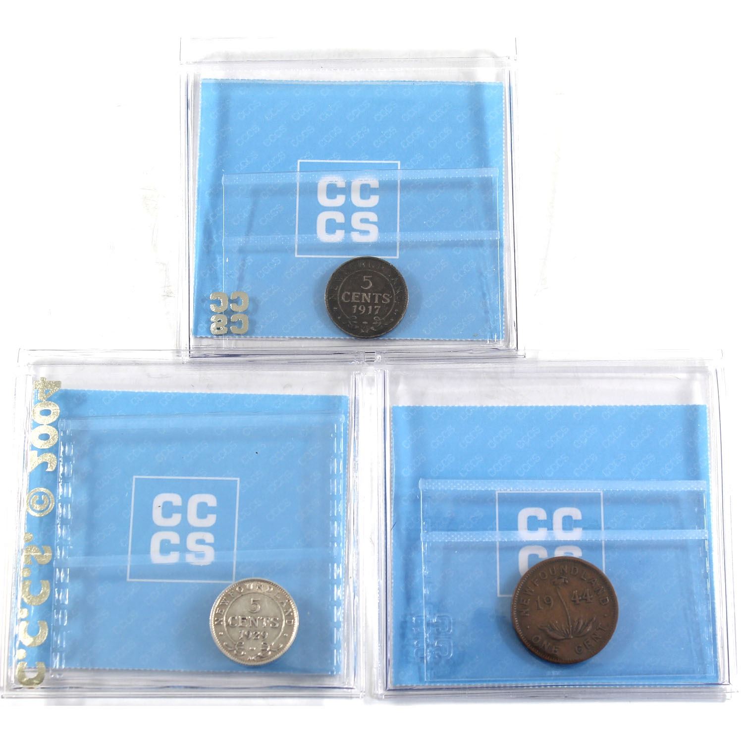 1917-1944 Newfoundland 1-cent & 5-cent CCCS Certified Collection. 1944C 1-cent VF-20, 1917C 5-cent VG-10, & 1929 5-cent EF-40. 3pcs