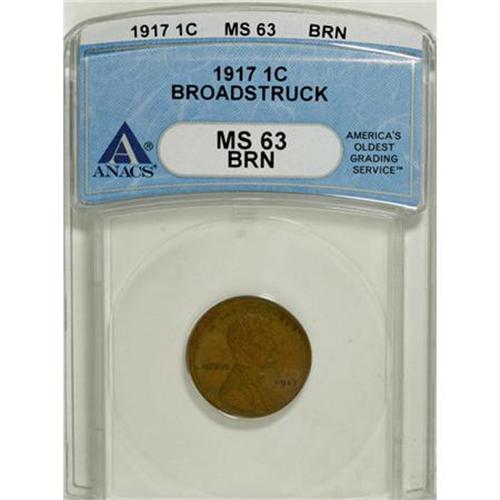 <B>1917 1C --Broadstruck--MS63 Brown ANACS.</B></I> <BR><BR><B>Coin Engraver:</B> Victor D. Brenner<BR><BR><b>Shipping:</b> Coins & Currency (<a target="_blank" href="http://www.heritageauctions.com/common/shipping.php">view shipping information</a>)