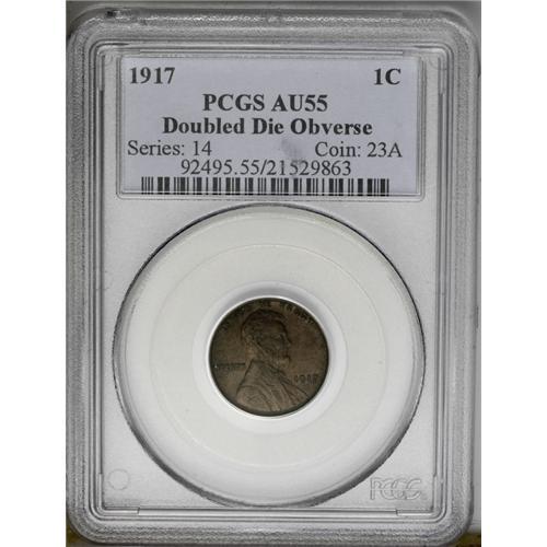 <B>1917<1C> Doubled Die AU55 PCGS.</B></I> FS-013. Clear doubling is seen on WE TRUST and the 9 and 7 of the date. Well defined overall with even, chocolate-brown color and only a couple of tiny marks on the highpoints of the reverse. Scarce and highly collectible. Population: 4 in 55; only 6 are finer (6/06).