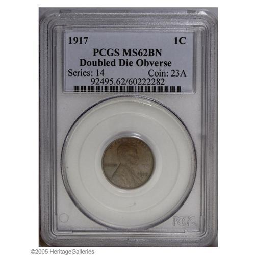<B>1917<1C> Doubled Die MS62 Brown PCGS.</B></I> FS-013. Under a loupe, obverse doubling is evident on the letters in WE TRUST, and on the digits 7 and 9 in the date. A widely publicized mint error, the 1917 Doubled Die is listed on page 114 of the 2006 <I>Guide Book,</B></I> page 229 of Breen's <I>Encyclopedia,</B></I> and page 95 of Fivaz and Stanton's <I>Cherrypicker's Guide to Rare Die Varieties (Fourth Ed., Vol. I.</B></I> Although obviously popular today, this error went unnoticed until 1977, by which time most examples had acquired heavy wear from circulation.<BR> This Mint State specimen certainly ranks high among the known examples of this scarce variety. The surfaces are predominantly chocolate-brown in color with a few accents of red-orange and blue-green patina. Both sides are free of sizeable abrasions, but a few wispy blemishes are evident using magnification. Nevertheless, this important example is worthy of a carefully considered bid.