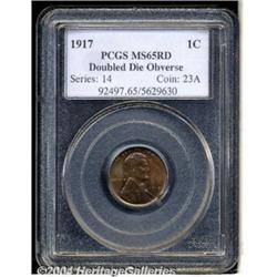 <B>1917<1C> Doubled Die MS65 Red PCGS.</B></I> FS-013. Breen-2081. Not discovered until 1977, the Doubled Die 1917 is predictably rare in all grades with the usual example (when found) in the lower circulated grades. The doubling is really quite pronounced, and certainly not in the realm of "micromatics," as is often the case with doubled dies discovered in recent years. The doubling is most easily seen on WE TRUST and the date. Considered by Fivaz-Stanton as "one of the top five Lincoln cent varieties." It is extremely rare in Mint State with Gems of the utmost importance. Only two other pieces have been so graded with six finer (7/04). The surfaces of this coin have deep cherry-red color with an occasional dash of gray-lilac interspersed here and there. Sharply defined, there are no obvious or distracting abrasions on either side. <BR><BR><B>Important notice:</B> Heritage usually auctions material at the rate of 200-250 lots per hour. On some occasions eBay Live bid software or the Internet may not be able to keep up with the pace of the auction. We recommend placing a realistic absentee bid now as insurance to avoid disappointment. Occasionally the auctioneer may eliminate or reject an eBay Live bid, and the auctioneer may also reopen a lot after the close of the eBay live bidding (usually because we missed an audience bid), and may reject your bid even if it shows you as the winning bidder. By bidding via eBay Live, you agree that Heritage may award the lot to another bidder at its sole discretion under the circumstances described above or any other reasonable circumstances. Since eBay bids are not shown to us until we open the lot on the floor, we treat those bids just like floor bids. In most cases the floor responds before the eBay bid is presented to us, due to Internet lag time, so for consistency we have made it a policy that floor bids are always considered first over tie eBay live bids. Also please note that all Heritage lots purchased through eBay Live carry a 20% Buyer's Premium. Please make sure you read the Terms and Conditions before you bid. </span></font></tr></table></td></tr></table>