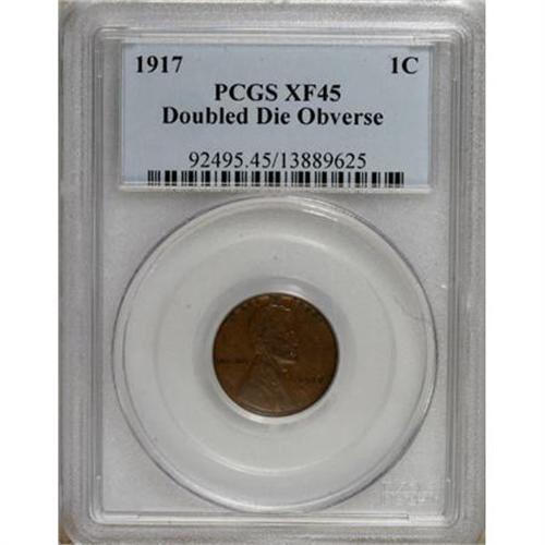 <B>1917 1C Doubled Die Obverse XF45 PCGS.</B></I> FS-013. Clear doubling is seen on WE TRUST and the 9 and 7 of the date. Medium brown color with hints of underlying red covers the surfaces of both obverse and reverse. Nice definition is apparent on the design features, including near-complete separation in the lines and grains of the wheat stalks. David Lange (2005) writes that: "This variety is illustrated in ... the <I>Red Book</B></I>, also in Walter Breen's ... <I>Encyclopedia</B></I>. This assures that it will always be in demand and command a premium price when properly attributed."<BR><BR><b>Shipping:</b> Coins & Currency (<a target="_blank" href="http://www.heritageauctions.com/common/shipping.php">view shipping information</a>)