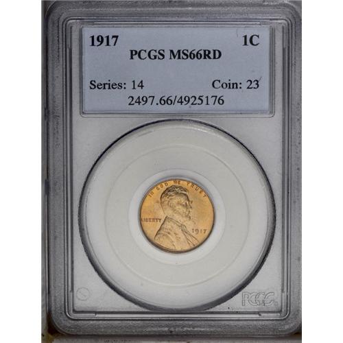 <B>1917<1C> MS66 Red PCGS.</B></I> A bold, well struck example of the issue, as is to be expected of Gem specimens of this high mintage date. Blazing luster highlights the bright orange-gold toning and rough, satiny texture of the fields. The reverse is a study in perfection, and the obverse is nearly its equal, with some insubstantial spotting and chatter in the fields that is only mentioned for the sake of accuracy. Rare any finer.<BR><I>From The Kendall Marie #4 All-Time Finest PCGS Registry of Lincoln Cents with Varieties, Circulation Strikes, 1909-1958.</B></I> <BR><BR><B>Important notice:</B> Heritage usually auctions material at the rate of 200-250 lots per hour. On some occasions eBay Live bid software or the Internet may not be able to keep up with the pace of the auction. We recommend placing a realistic absentee bid now as insurance to avoid disappointment. Occasionally the auctioneer may eliminate or reject an eBay Live bid, and the auctioneer may also reopen a lot after the close of the eBay live bidding (usually because we missed an audience bid), and may reject your bid even if it shows you as the winning bidder. By bidding via eBay Live, you agree that Heritage may award the lot to another bidder at its sole discretion under the circumstances described above or any other reasonable circumstances. Since eBay bids are not shown to us until we open the lot on the floor, we treat those bids just like floor bids. In most cases the floor responds before the eBay bid is presented to us, due to Internet lag time, so for consistency we have made it a policy that floor bids are always considered first over tie eBay live bids. Also please note that all Heritage lots purchased through eBay Live carry a 20% Buyer's Premium. Please make sure you read the Terms and Conditions before you bid. This lot is being auctioned in conjunction with a live floor auction by Heritage Galleries & Auctioneers. All final auction and invoice information will be supplied by Heritage Galleries & Auctioneers, and all other information should be considered preliminary. Lot:490 <BR><BR><B>Winning Notification and Billing:</B> After the FINAL session in this auction is complete, Heritage will send e-mail and snail mail invoices. This process normally takes several days. All final auction and invoice information will be supplied by Heritage Galleries & Auctioneers, and all other information should be considered preliminary. <BR><BR>This auction will be conducted on a live auction floor and over the Internet through eBay Live. If you choose to place an absentee bid, please take a moment to <font color='#0000ff'><u><a href='http://pages.ebay.com/liveauctions/help/before/laabsentee.html'>learn how eBay Live absentee bidding works</a></u></font><font color='#000000'>