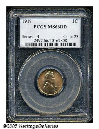 <B>1917<1C> MS66 Red PCGS.</B></I> Sharply struck with sparkling full luster and a marvelous display of mint-green, lilac, and auburn-red colors. The well preserved surfaces have a pleasingly matte-like texture on both sides, and, if not for a single small mark, on Lincoln's shoulder, the piece might have graded as a Superb Gem. Population: 117 in 66 Red, 11 finer (6/05).
