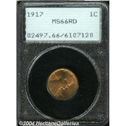 <B>1917<1C> MS66 Red PCGS.</B></I> This well struck cent displays a fresh, vibrant appearance, with bright luster that gleams from the satiny, beautifully toned orange-gold surfaces. The reverse seems pristine, while the obverse only shows a single carbon speck, and two or three really tiny contact marks. The coin's grade assessment may be respected even further, by virtue of its residence in a first-generation PCGS holder. A simply splendid premium quality Gem. Population: 105 in 66, 10 finer (9/04). <BR><BR><B>Important notice:</B> Heritage usually auctions material at the rate of 200-250 lots per hour. On some occasions eBay Live bid software or the Internet may not be able to keep up with the pace of the auction. We recommend placing a realistic absentee bid now as insurance to avoid disappointment. Occasionally the auctioneer may eliminate or reject an eBay Live bid, and the auctioneer may also reopen a lot after the close of the eBay live bidding (usually because we missed an audience bid), and may reject your bid even if it shows you as the winning bidder. By bidding via eBay Live, you agree that Heritage may award the lot to another bidder at its sole discretion under the circumstances described above or any other reasonable circumstances. Since eBay bids are not shown to us until we open the lot on the floor, we treat those bids just like floor bids. In most cases the floor responds before the eBay bid is presented to us, due to Internet lag time, so for consistency we have made it a policy that floor bids are always considered first over tie eBay live bids. Also please note that all Heritage lots purchased through eBay Live carry a 20% Buyer's Premium. Please make sure you read the Terms and Conditions before you bid.