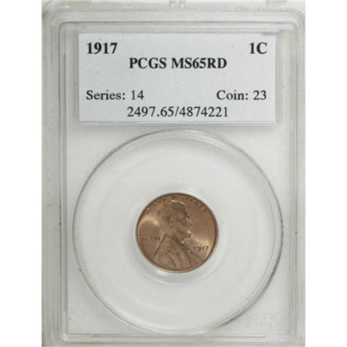 <B>1917 1C MS65 Red PCGS.</B></I> . PCGS Population (222/144). NGC Census: (55/26). Mintage: 196,429,792. Numismedia Wsl. Price for NGC/PCGS coin in MS65: $140. (#2497)<BR><BR><B>Coin Engraver:</B> Victor D. Brenner<BR><BR><b>Shipping:</b> Coins & Currency (<a target="_blank" href="http://www.heritageauctions.com/common/shipping.php">view shipping information</a>)