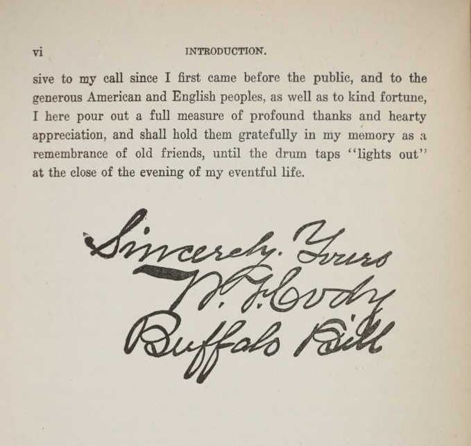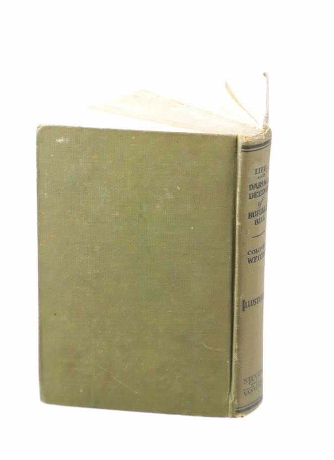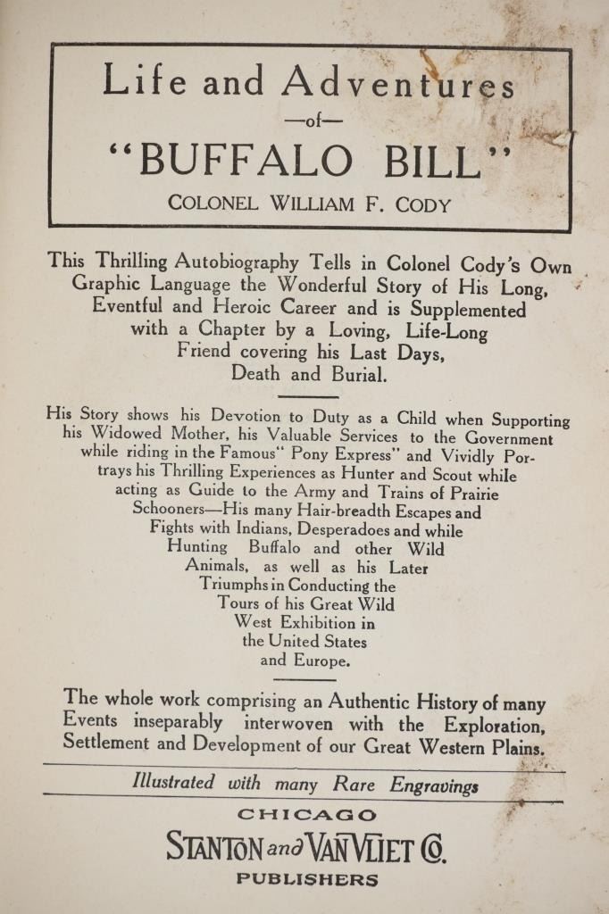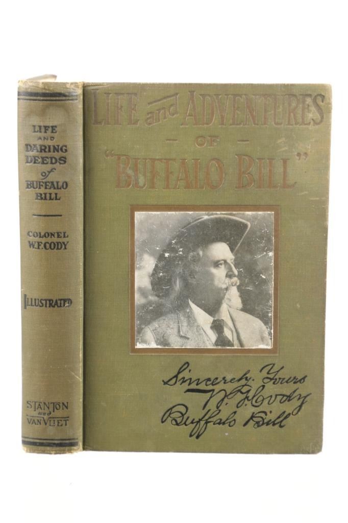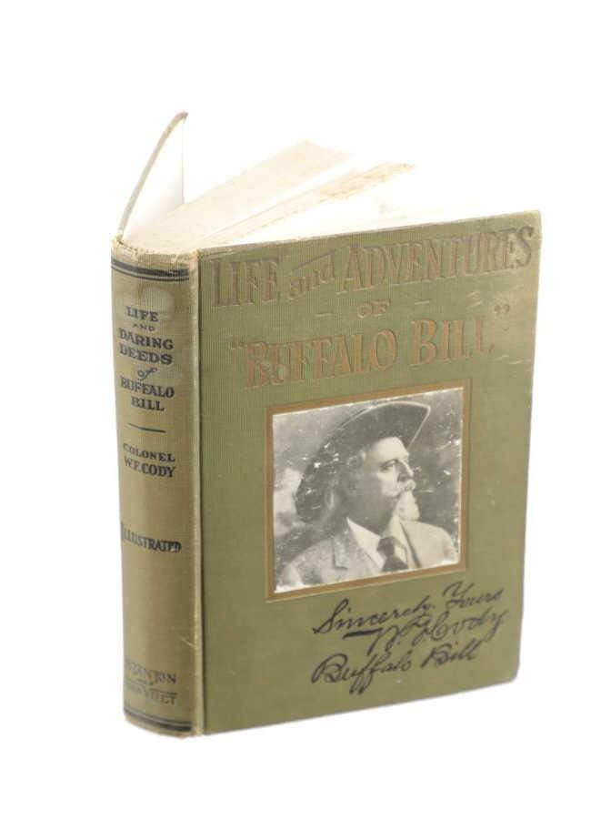 Featured in this lot is a 1917 First Edition of, "Life and Adventures of Buffalo Bill," by Colonel William F. Cody, Stanton and Van Vliet Co. Publishers, Chicago. The book chronicles the thrilling life and times of one of the greatest adventurers of the late 1800s and early 1900s. From his start as an army scout during the westward expansion to the Buffalo Bill's Wild West Show, this book is an exciting read as Buffalo Bill's own words grace its pages. The condition of this green-cloth bound, hardback, with gold gilt book is fair overall, scuffing exhibited to the cover's edges. Front cover photograph of Buffalo Bill has fading. The intact pages exhibit age related tanning and foxing. No other obvious marring observed. The book measures 5.5"W 7.75"L x 1"D, weight 1lb.