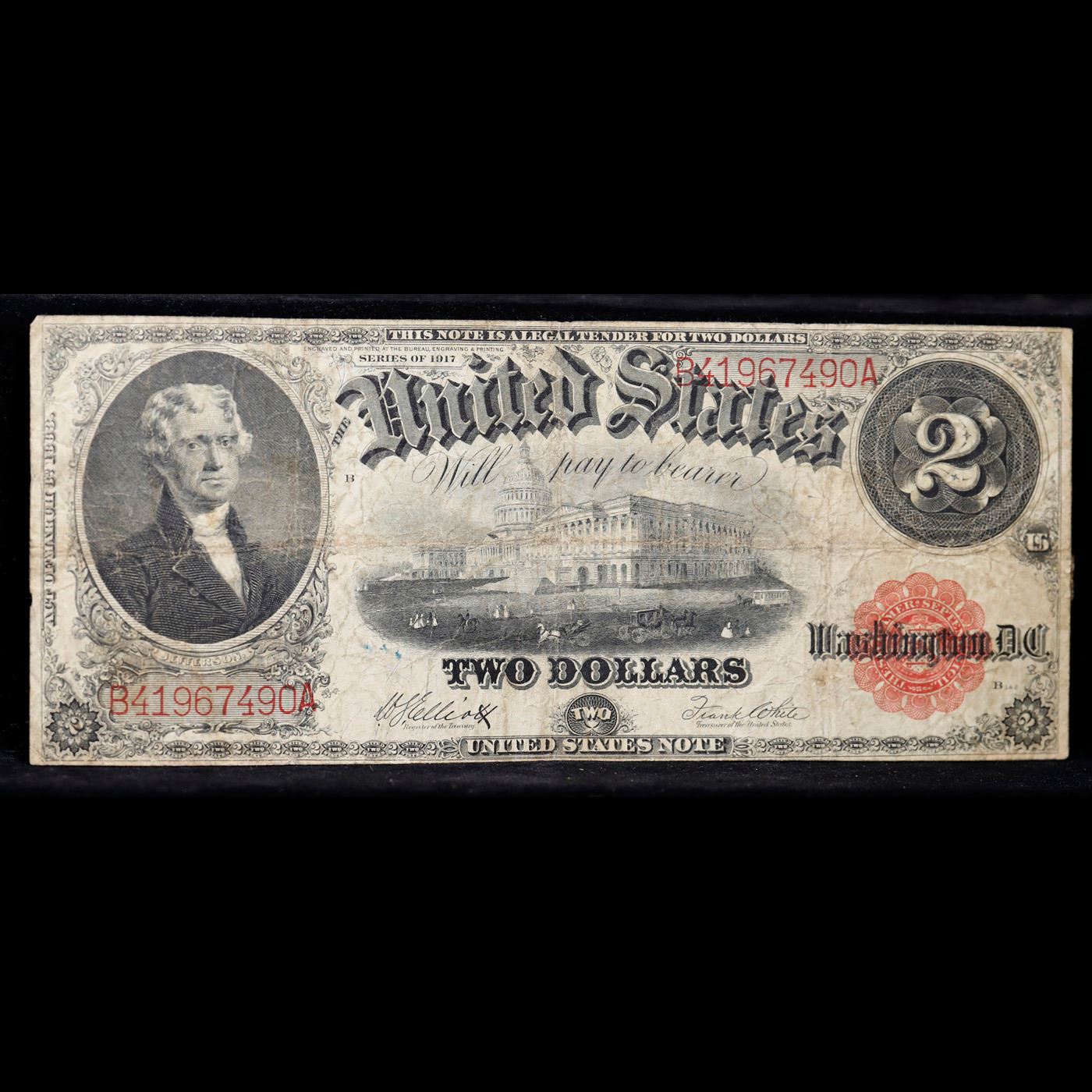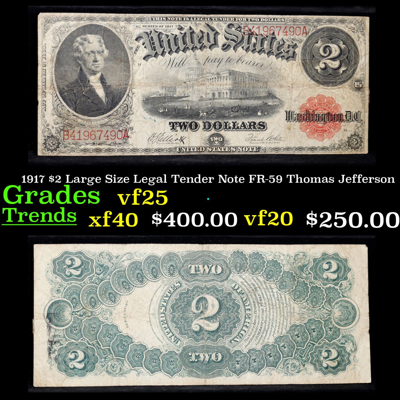 1917 $2 Large Size Legal Tender Note FR-59 Thomas Jefferson Grades vf+. This 1917 $2 Jefferson Legal Tender Currency Note is only the second two dollar bill in history. It shows a portrait of Jefferson and an old vignette of the Capitol building from way back in the day. The reverse features a prominent fancy "2" surrounded by a "bracelet" of seals. The intricate engraving, the bold red seal, and serial number create a fantastic image; You can't stop studying it! This is the last large size $2 legal tender note ever printed.