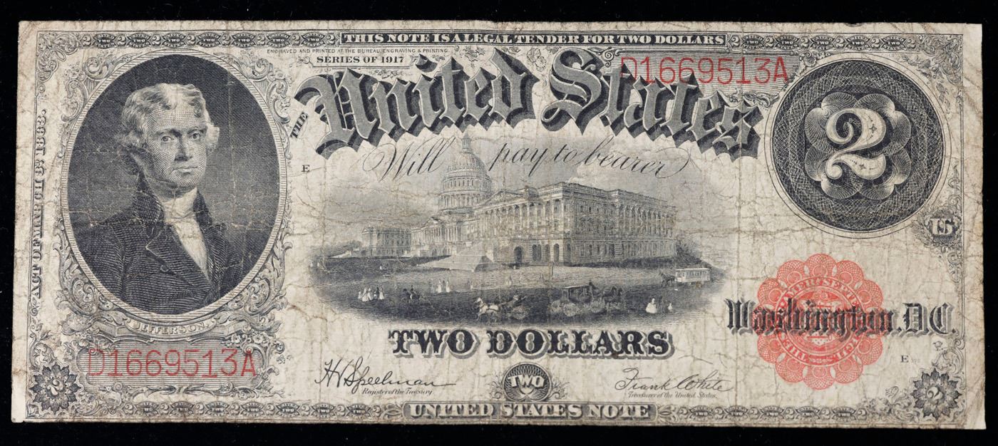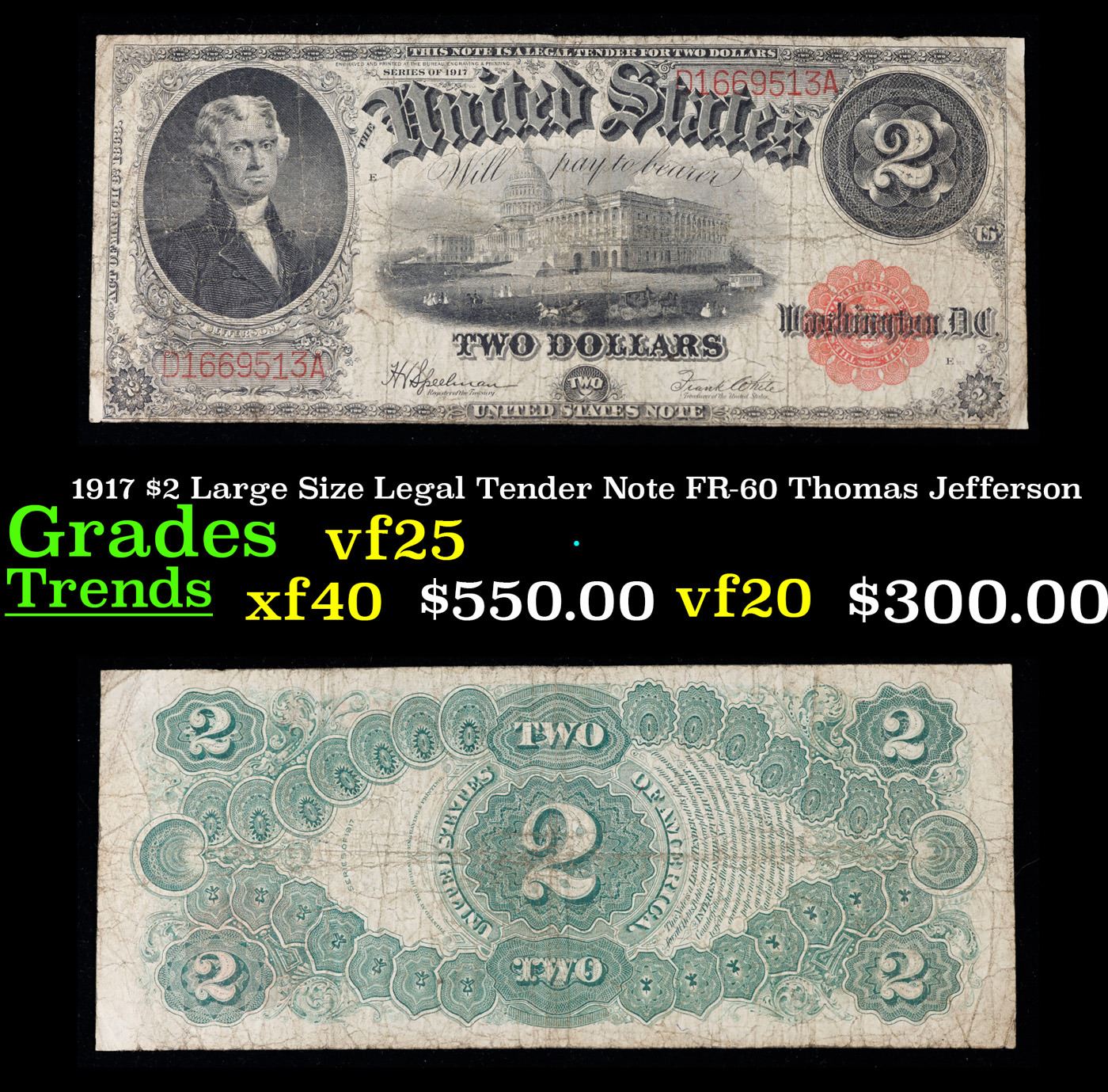 1917 $2 Large Size Legal Tender Note FR-60 Thomas Jefferson Grades vf+. This 1917 $2 Jefferson Legal Tender Currency Note is only the second two dollar bill in history. It shows a portrait of Jefferson and an old vignette of the Capitol building from way back in the day. The reverse features a prominent fancy "2" surrounded by a "bracelet" of seals. The intricate engraving, the bold red seal, and serial number create a fantastic image; You can't stop studying it! This is the last large size $2 legal tender note ever printed.
