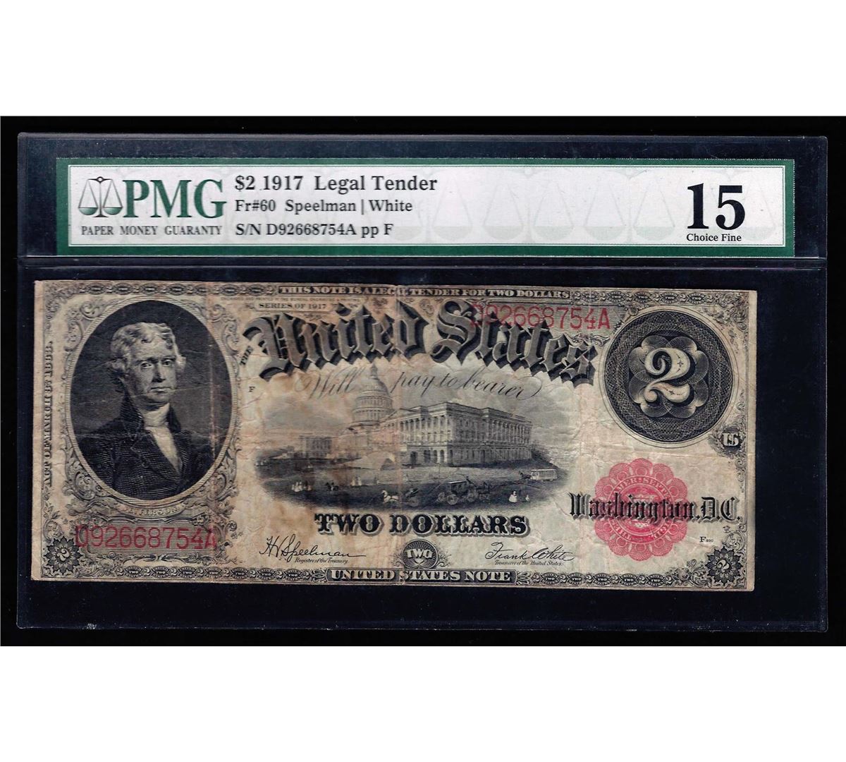 One 1917 $2 Large Size Legal Tender Note PMG Graded Choice Fine 15. PMG Certified.