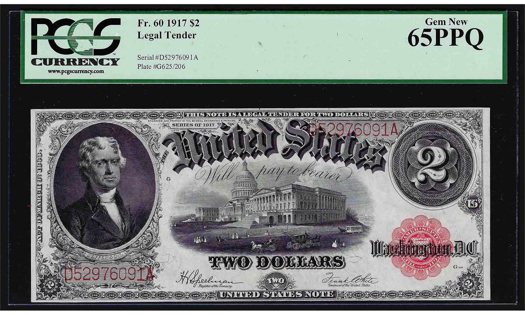 One 1917 $2 Legal Tender Note Fr.60 PCGS Gem New 65PPQ. PCGS Graded.