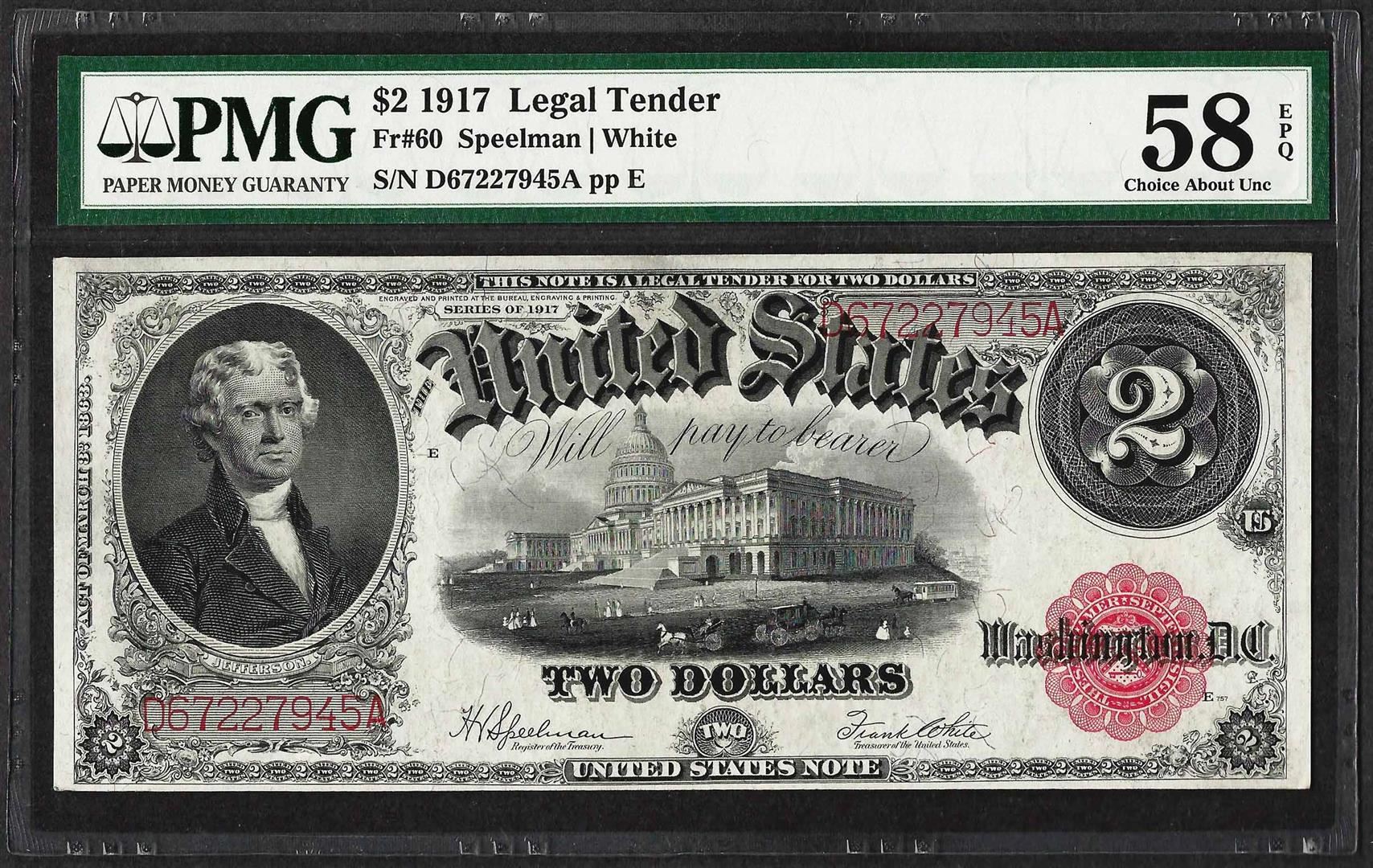 One 1917 $2 Legal Tender Note Fr.60 PMG Choice About Uncirculated 58EPQ. PMG Certified.