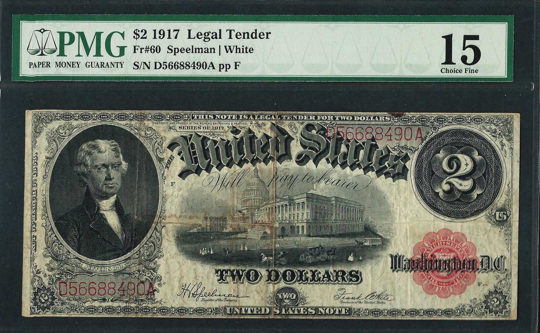 One 1917 $2 Legal Tender Note Fr.60 PMG Choice Fine 15. PMG Certified.