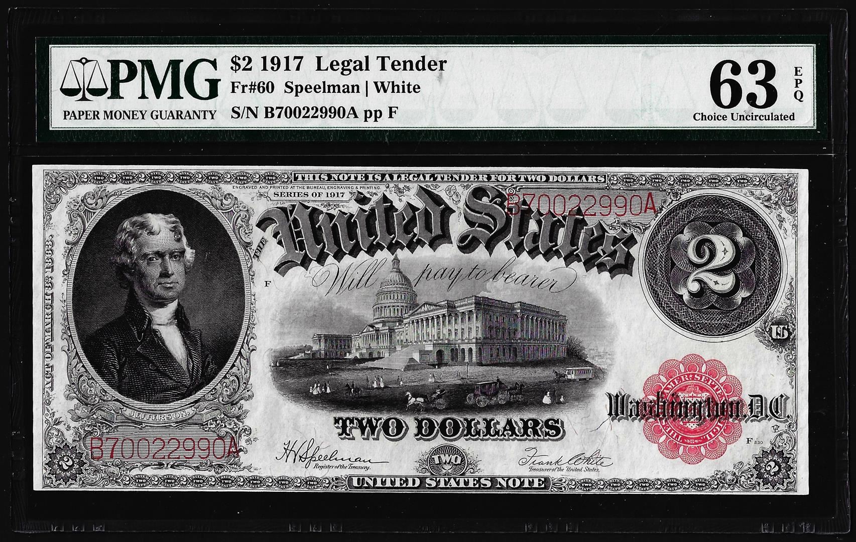 One 1917 $2 Legal Tender Note Fr.60 PMG Choice Uncirculated 63EPQ. PMG Certified.