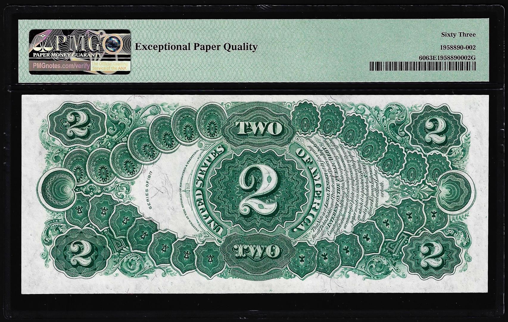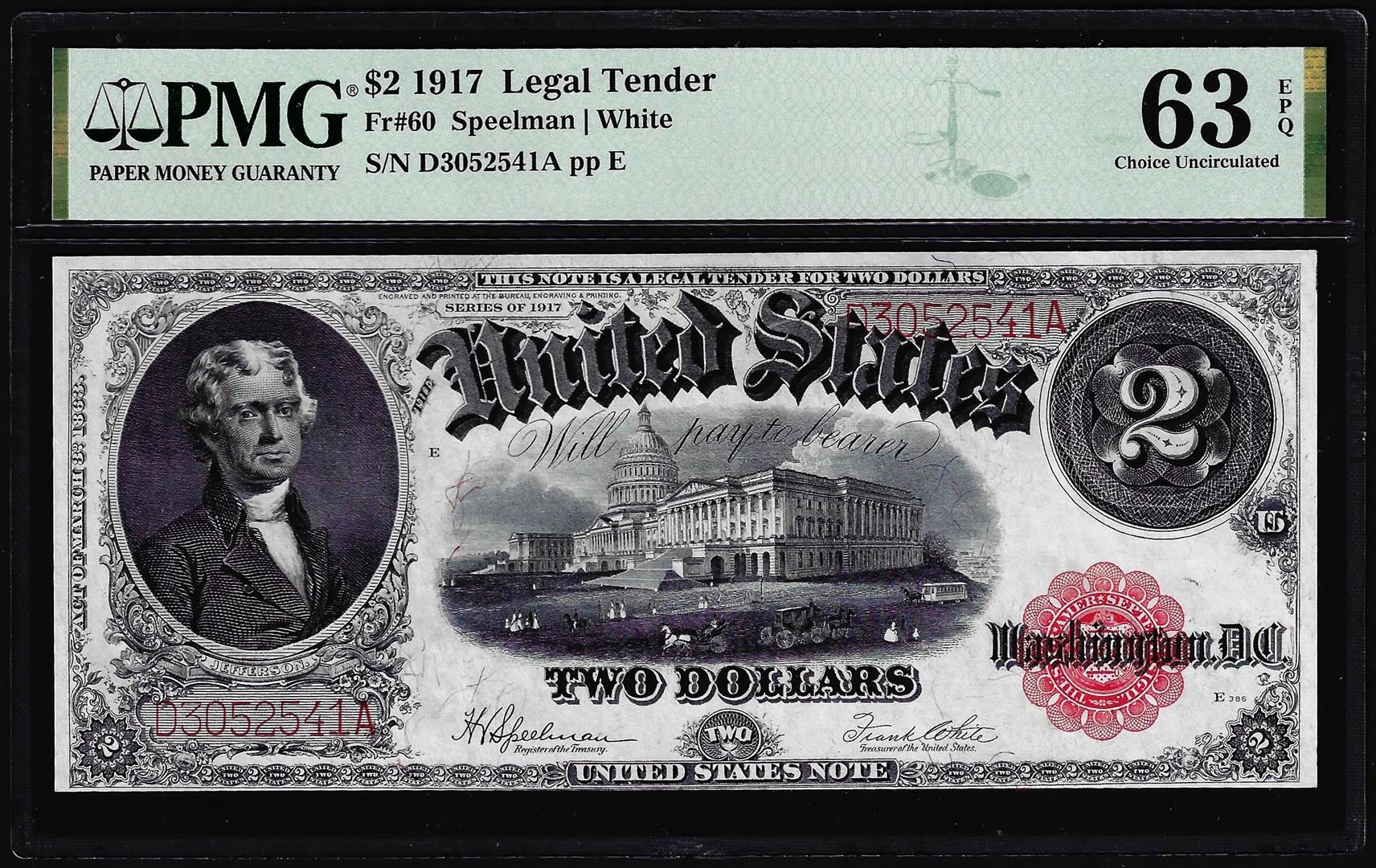One 1917 $2 Legal Tender Note Fr.60 PMG Choice Uncirculated 63EPQ. PMG Certified.