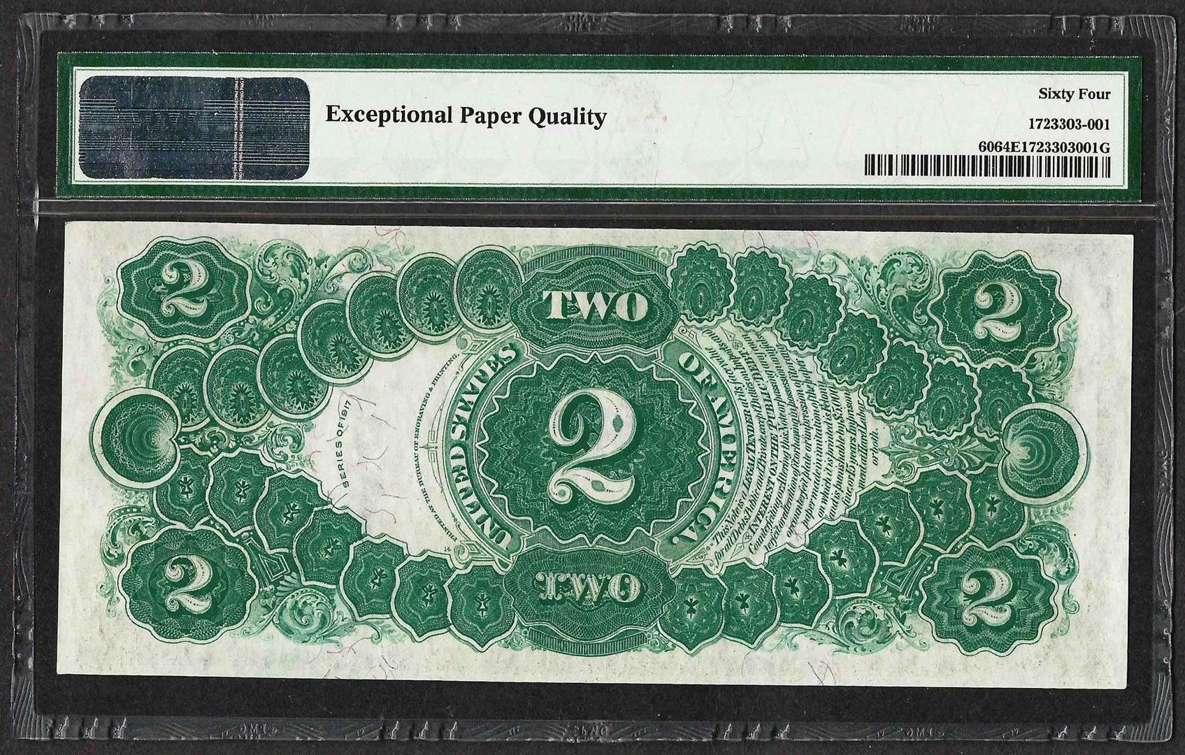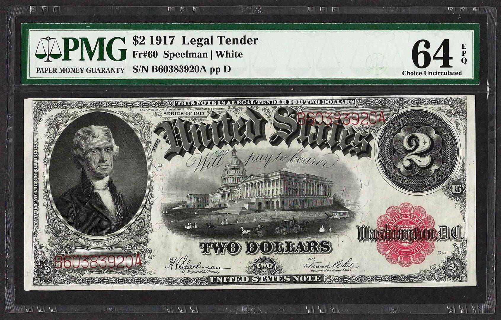 One 1917 $2 Legal Tender Note Fr. 60 PMG Choice Uncirculated 64EPQ. PMG Certified.