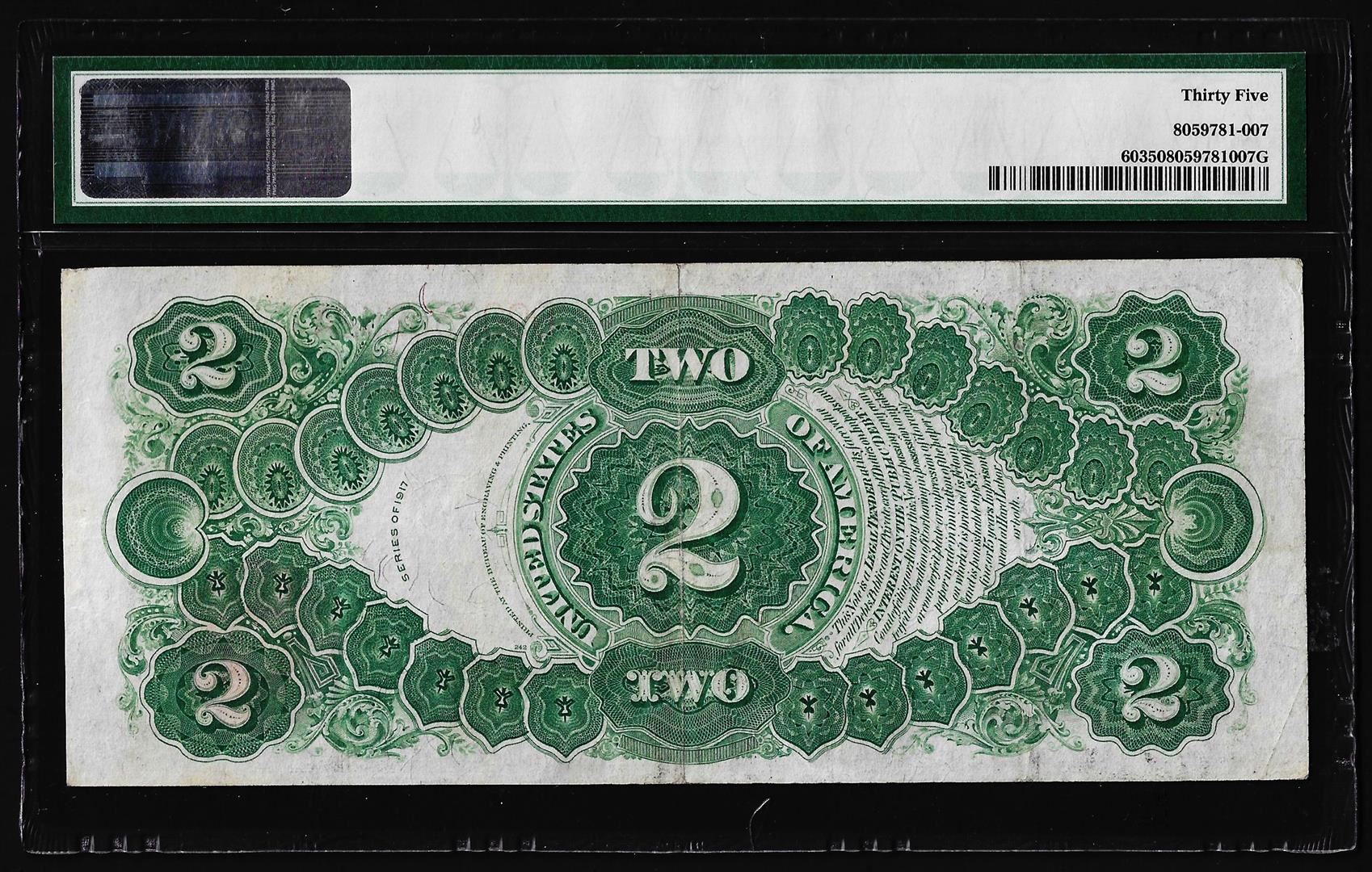 One 1917 $2 Legal Tender Note Fr.60 PMG Choice Very Fine 35. PMG Certified.