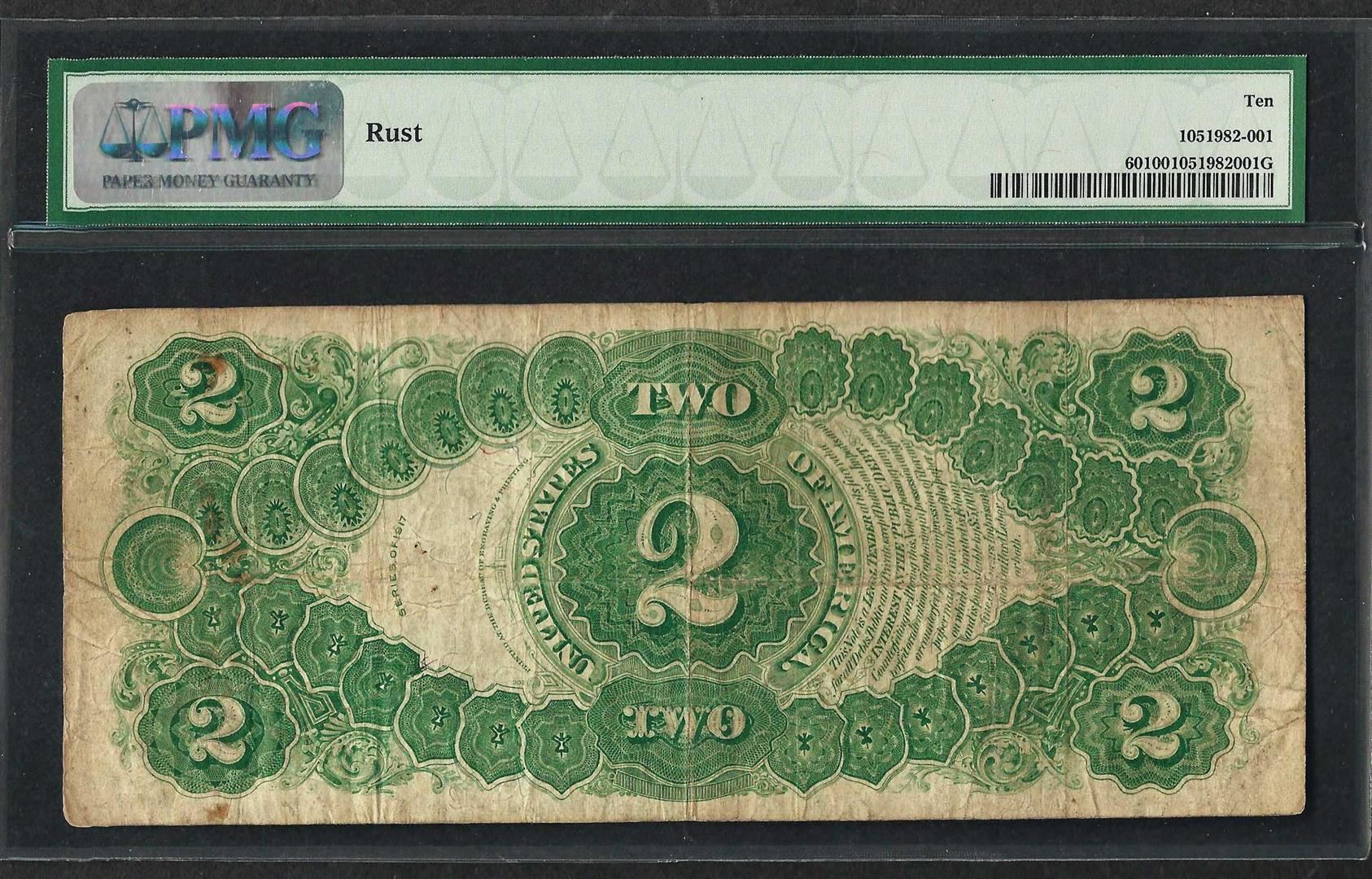 One 1917 $2 Legal Tender Note Fr.60 PMG Very Good 10. PMG Certified.