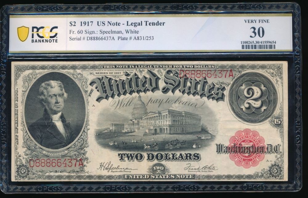 One 1917 $2 Legal Tender Note PCGS 30.