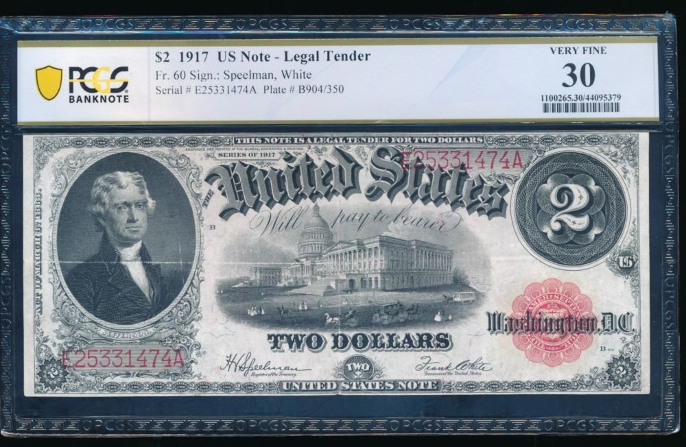 One 1917 $2 Legal Tender Note PCGS 30.
