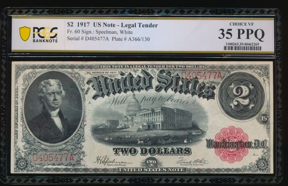 One 1917 $2 Legal Tender Note PCGS 35PPQ.