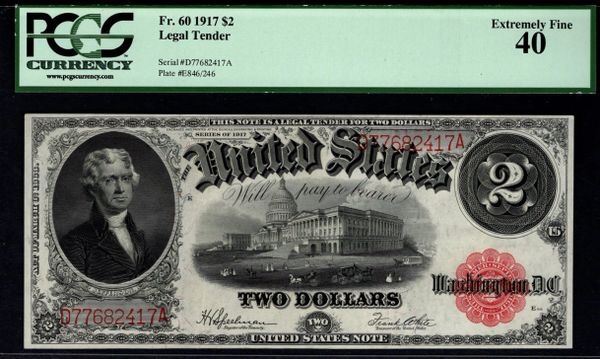 One 1917 $2 Legal Tender Note PCGS 40.