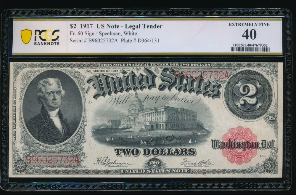 One 1917 $2 Legal Tender Note PCGS 40.
