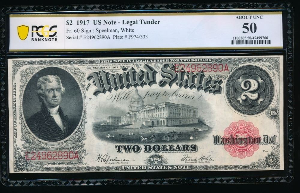 One 1917 $2 Legal Tender Note PCGS 50.