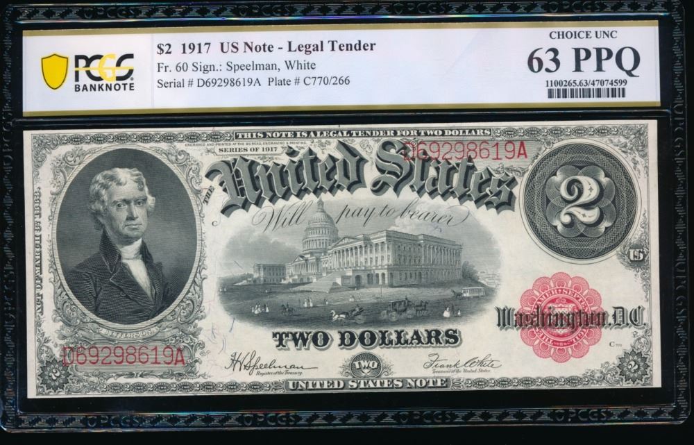 One 1917 $2 Legal Tender Note PCGS 63PPQ.