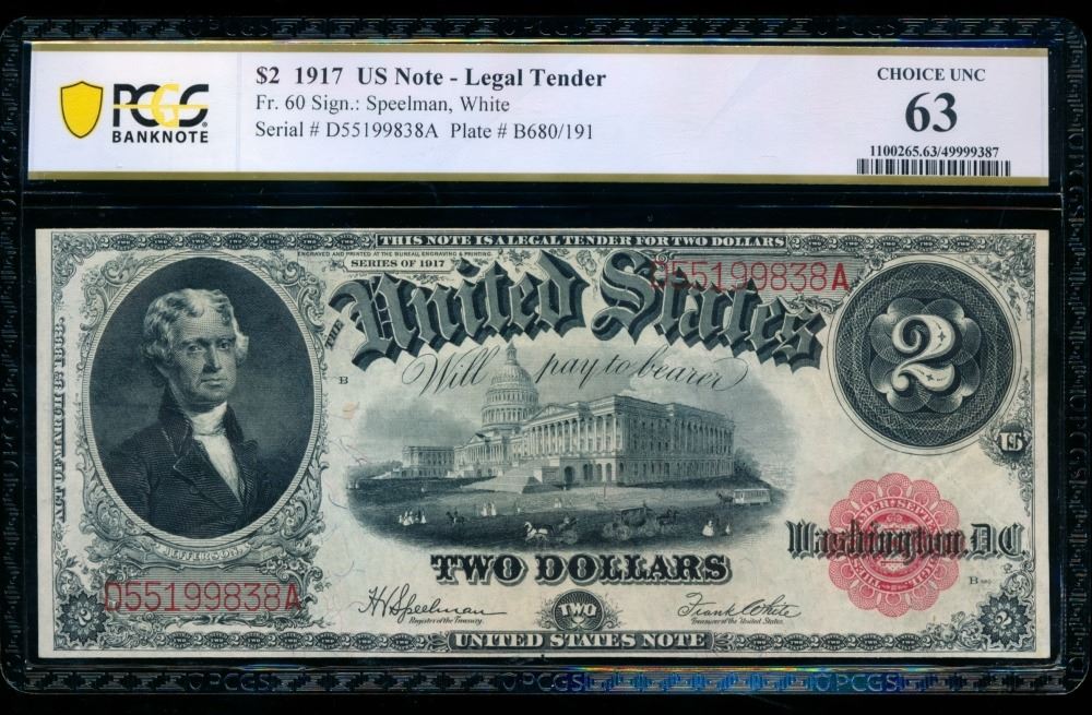 One 1917 $2 Legal Tender Note PCGS 63.