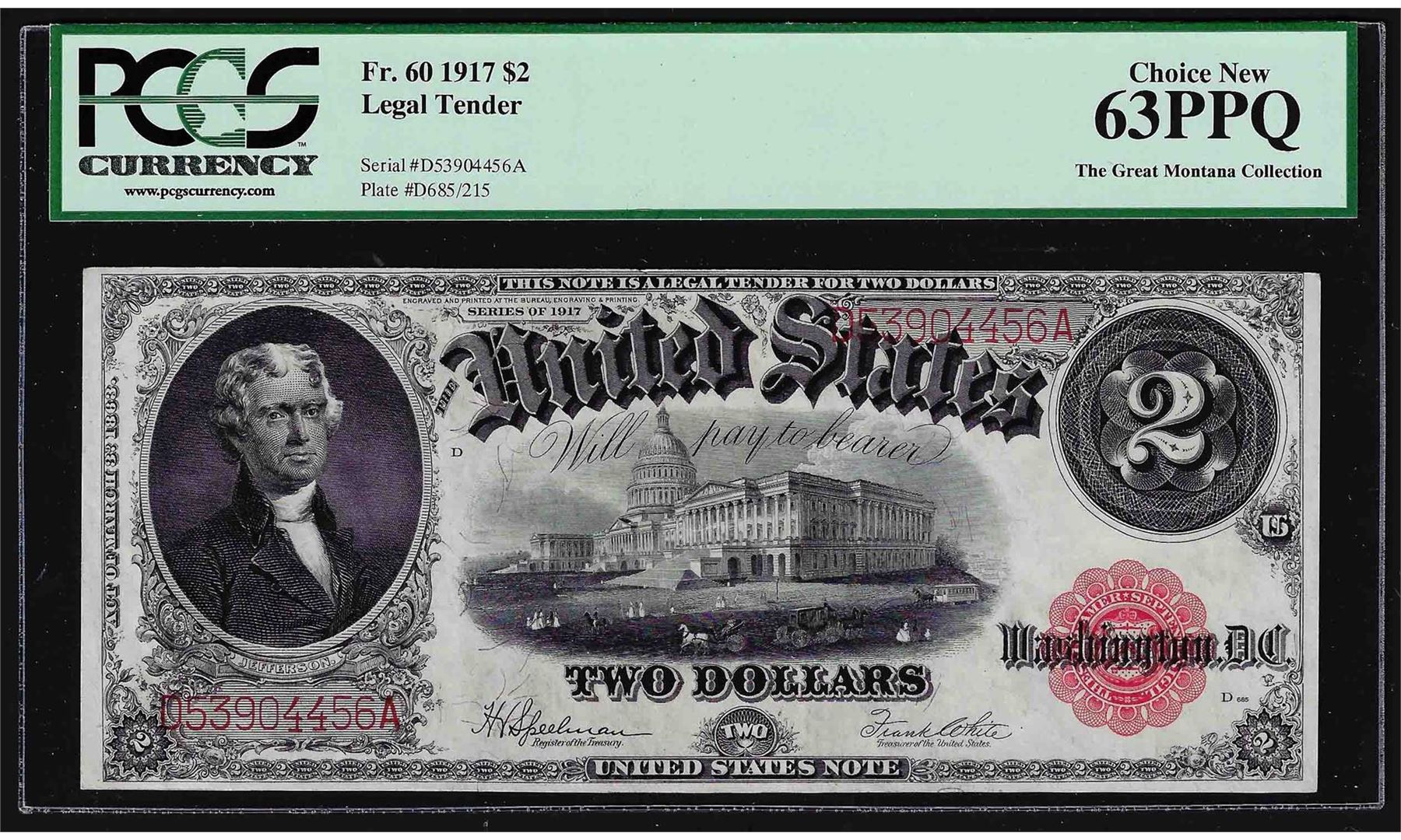 One 1917 $2 Legal Tender Note PCGS Choice New 63PPQ. PCGS Graded.