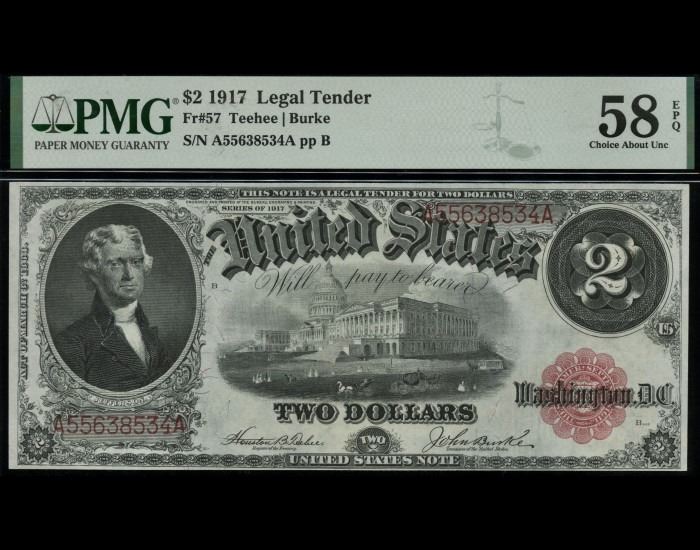 One 1917 $2 Legal Tender Note PMG 58EPQ.