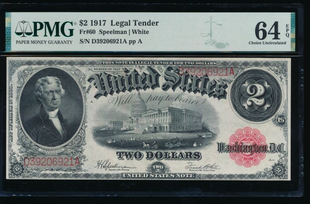 One 1917 $2 Legal Tender Note PMG 64EPQ.