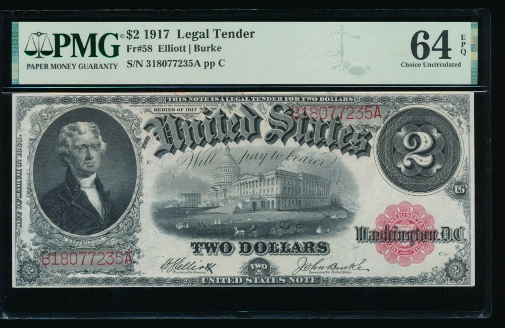 One 1917 $2 Legal Tender Note PMG 64EPQ.