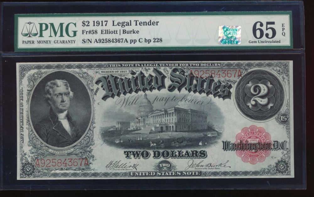 One 1917 $2 Legal Tender Note PMG 65EPQ.