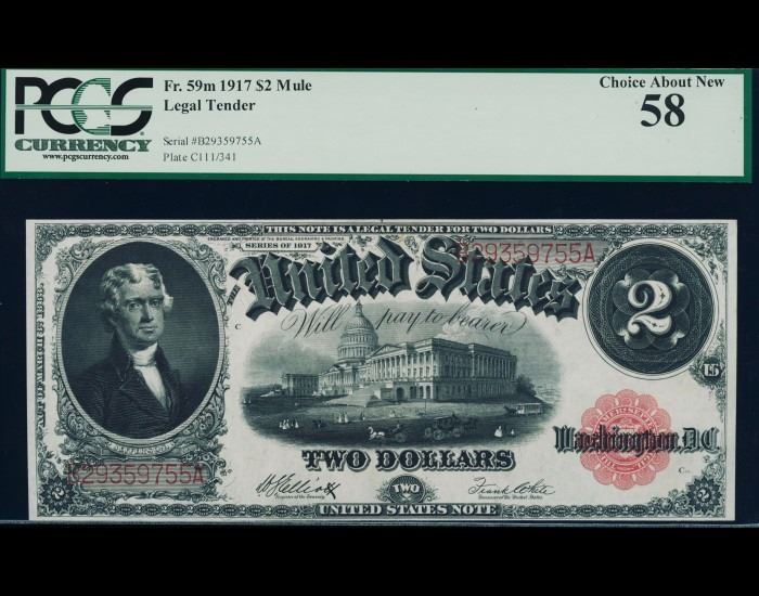 One 1917 $2 Mule Legal Tender Note PCGS 58.