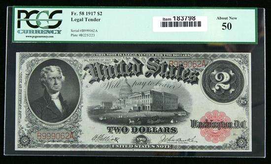 1917, $2 United States Note. PCGS About New 50. . Fr-58. A couple of light hidden bends are all that prevent a higher grade on this bright example that possesses bold contrast between the inks and paper.