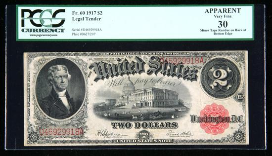 1917, $2 United States Note. PCGS Currency Apparent Very Fine 30. . Fr-60. As PCGS Currency has noted on their grading label, there is some minor tape residue on the back at the bottom edge. It is a small spot, and might possible be removable by an expert, but otherwise affects very little and the note faces up quite nicely for the grade.