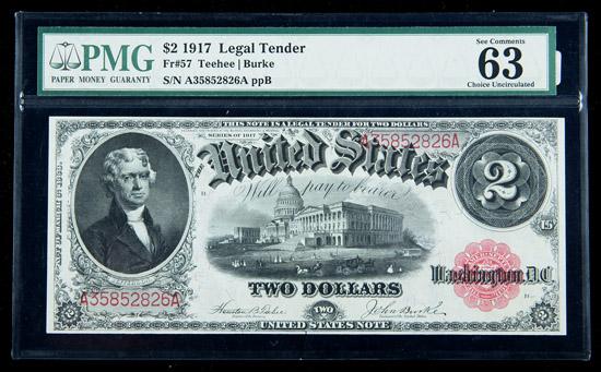 1917, $2 United States Note. PMG Choice Uncirculated 63EPQ. . Fr-57. This Deuce appears very nice for the grade, with margins that would seemingly support a "64." It looks fully original and well embossed through the PMG holder.