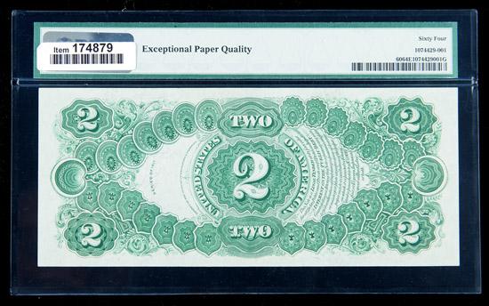1917, $2 United States Note. PMG Choice Uncirculated 64EPQ. . Fr-60. This is an "E" plate position note from the top of a sheet, with a resulting extra large top margin. The bottom margin is the grade limiting factor as it is comparatively thin and tight.