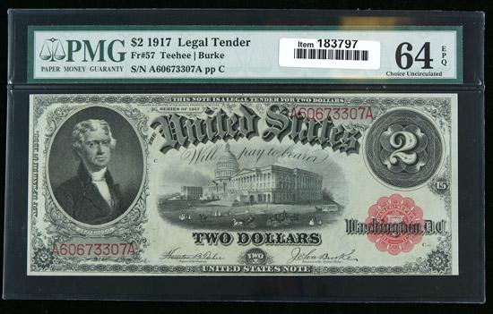 1917, $2 United States Note. PMG Choice Uncirculated 64EPQ. . Fr-57. Fully original, with embossing evident through the holder, and with bold colors throughout. The margins, slightly skewed, are all that limit the grade. `.