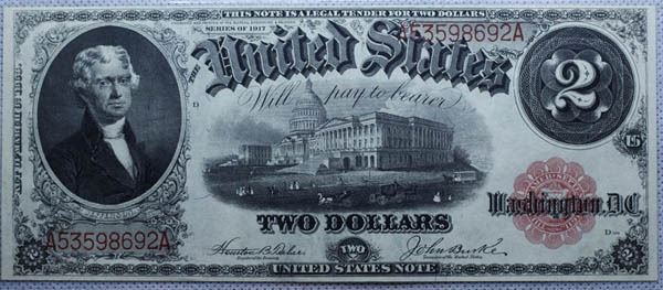 1917, 2 United States Note. S/N A53598692A pp D. Teehee / Burke. Exceptional paper quality. PMG graded Gem Uncirculated 65 EPQ.