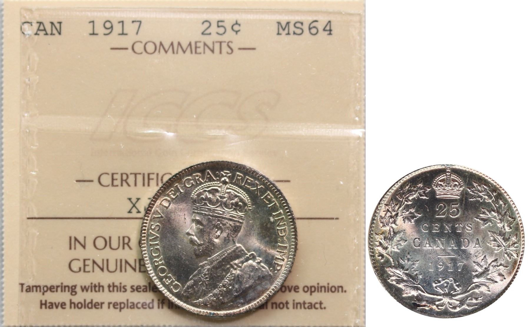 1917 25¢ ICCS Very Choice Mint State-64 Fully brilliant and lustrous with delicate golden tone.