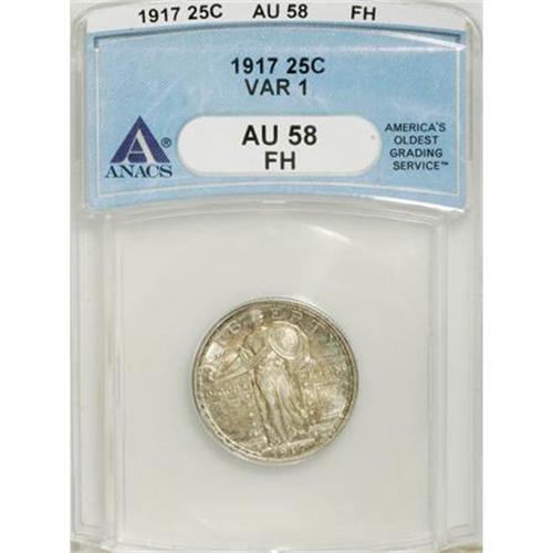 <B>1917 25C Type One AU58 Full Head ANACS.</B></I> NGC Census: (197/2801). PCGS Population (337/3859). Mintage: 8,740,000. Numismedia Wsl. Price for NGC/PCGS coin in AU58: $175. (#5707)<BR><BR><B>Coin Engraver:</B> Hermon A. MacNeil<BR><BR><b>Shipping:</b> Coins & Currency (<a target="_blank" href="http://www.heritageauctions.com/common/shipping.php">view shipping information</a>)