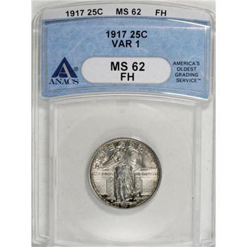 <B>1917 25C Type One MS62 Full Head ANACS.</B></I> NGC Census: (327/2405). PCGS Population (372/3430). Mintage: 8,740,000. Numismedia Wsl. Price for NGC/PCGS coin in MS62: $240. (#5707)<BR><BR><B>Coin Engraver:</B> Hermon A. MacNeil<BR><BR><b>Shipping:</b> Coins & Currency (<a target="_blank" href="http://www.heritageauctions.com/common/shipping.php">view shipping information</a>)