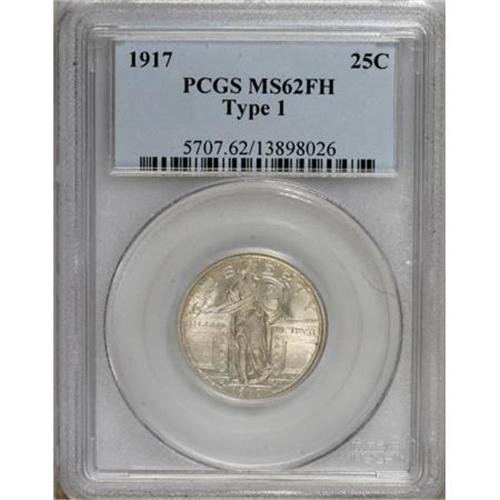 <B>1917 25C Type One MS62 Full Head PCGS.</B></I> PCGS Population (368/3378). NGC Census: (326/2385). Mintage: 8,740,000. Numismedia Wsl. Price for NGC/PCGS coin in MS62: $221. (#5707)<BR><BR><B>Coin Engraver:</B> Hermon A. MacNeil<BR><BR><b>Shipping:</b> Coins & Currency (<a target="_blank" href="http://www.heritageauctions.com/common/shipping.php">view shipping information</a>)