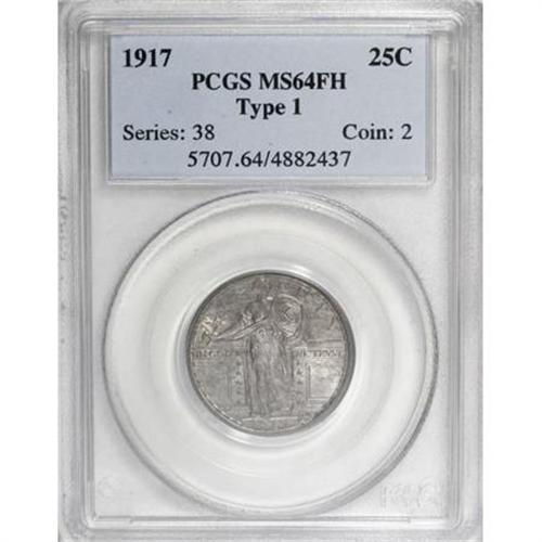 <B>1917 25C Type One MS64 Full Head PCGS.</B></I> PCGS Population (1354/1238). NGC Census: (1004/964). Mintage: 8,740,000. Numismedia Wsl. Price for NGC/PCGS coin in MS64: $535. (#5707)<BR><BR><B>Coin Engraver:</B> Hermon A. MacNeil<BR><BR><b>Shipping:</b> Coins & Currency (<a target="_blank" href="http://www.heritageauctions.com/common/shipping.php">view shipping information</a>)