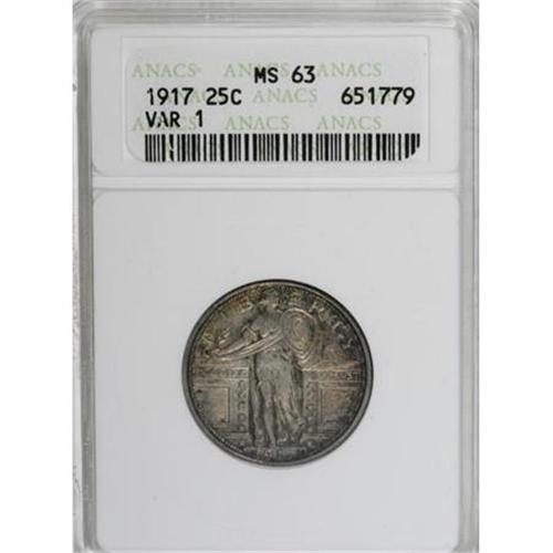 <B>1917 25C Type One MS63 ANACS.</B></I> NGC Census: (240/720). PCGS Population (479/856). Mintage: 8,740,000. Numismedia Wsl. Price for NGC/PCGS coin in MS63: $240. (#5706)<BR><BR><B>Coin Engraver:</B> Hermon A. MacNeil<BR><BR><b>Shipping:</b> Coins & Currency (<a target="_blank" href="http://www.heritageauctions.com/common/shipping.php">view shipping information</a>)
